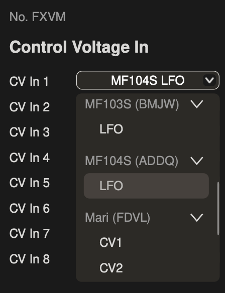 1. Open the CV panel and go to the dropdown menu for CV In 1. Find the MF-104S with the unique identifier corresponding to the particular instance you want to use and click LFO to route the MF-104S LFO to Mariana’s CV In 1.