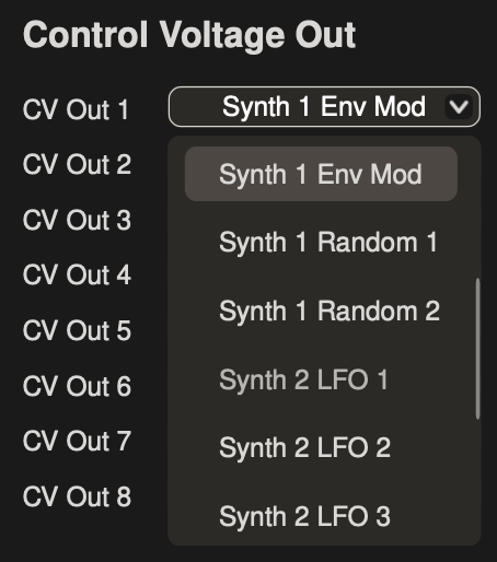 1. Open the CV panel and go to the dropdown menu for CV Out 1. Find Synth 1 Env Mod and click it to connect it to CV Out 1.