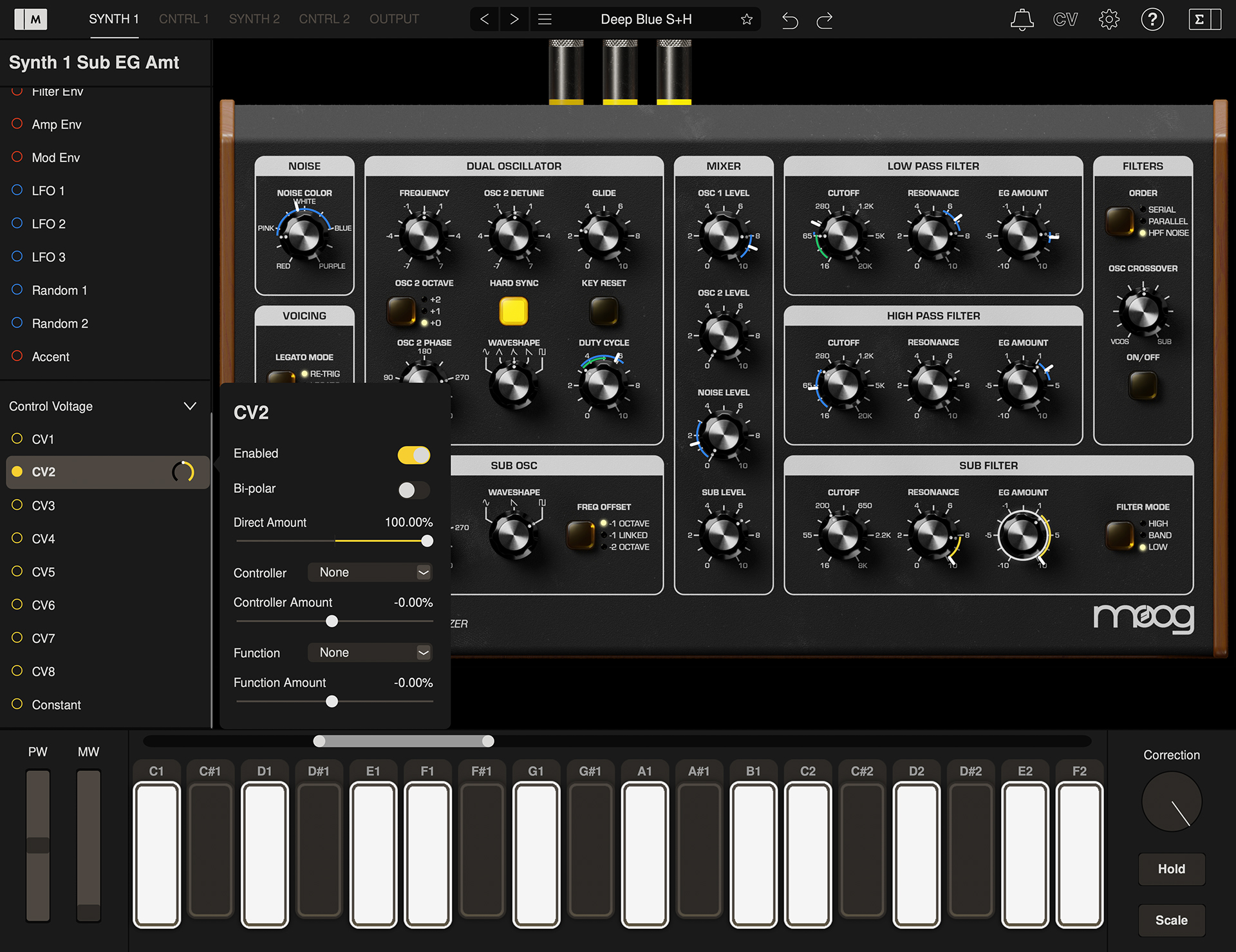 2. Go to the SYNTH 1 view and open the modulation editor. Click on the Low Pass Filter CUTOFF knob and select CV1 as your modulation source. Like any other modulation routing on Mariana, you can scale, offset, apply controllers, and apply functions to this modulation.
