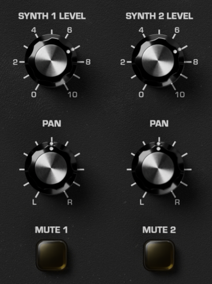 Each SYNTH has controls for the volume of the SYNTH, a PAN pot for stereo placement of each SYNTH, and a MUTE switch for each SYNTH.