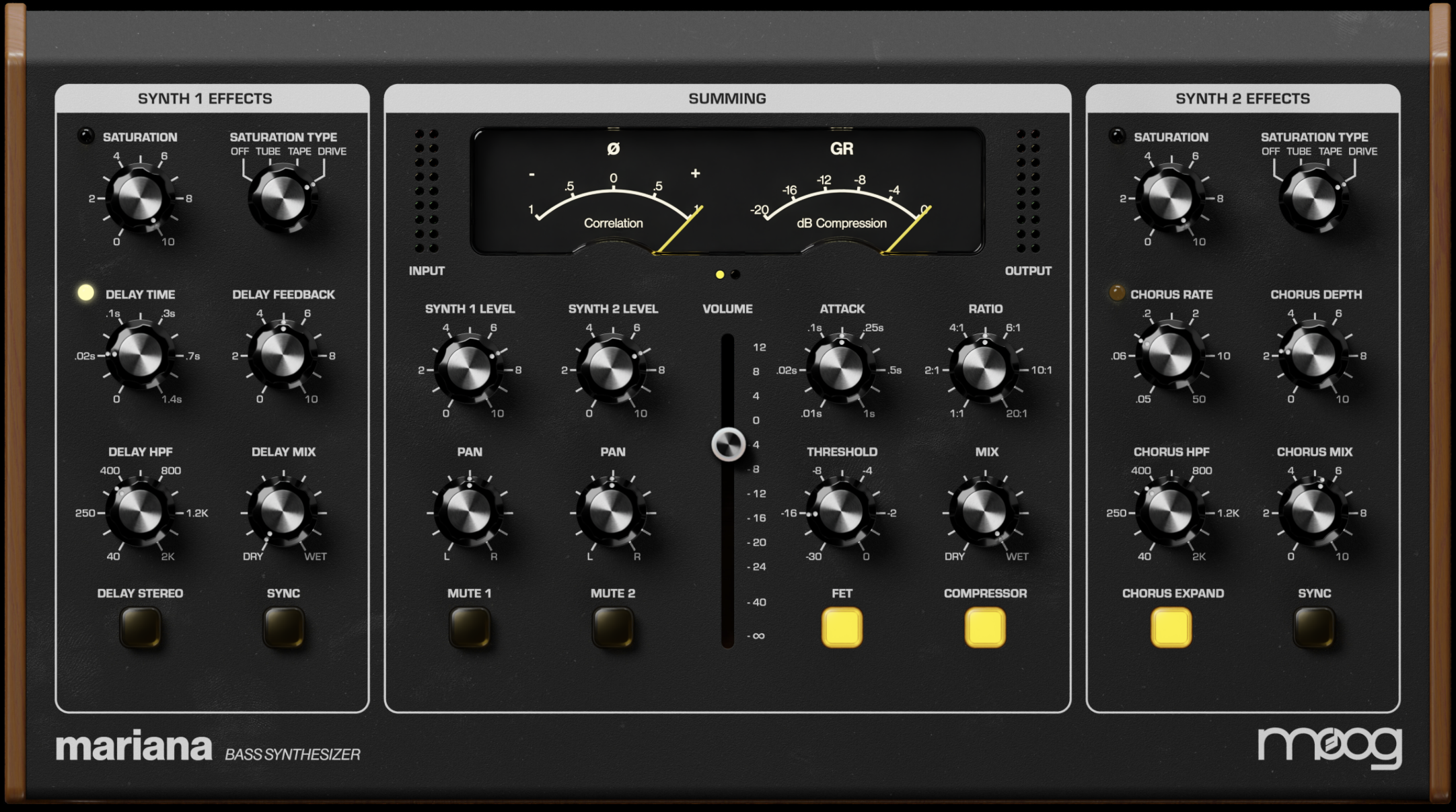 Summing is the final stage in Mariana before the output. It brings together both SYNTHs via a mixer, sets a master output VOLUME, and contains the COMPRESSOR for adding glue and extra control over the dynamics of your sounds. It also contains METERS for visual inspection of the final stereo output from Mariana.
