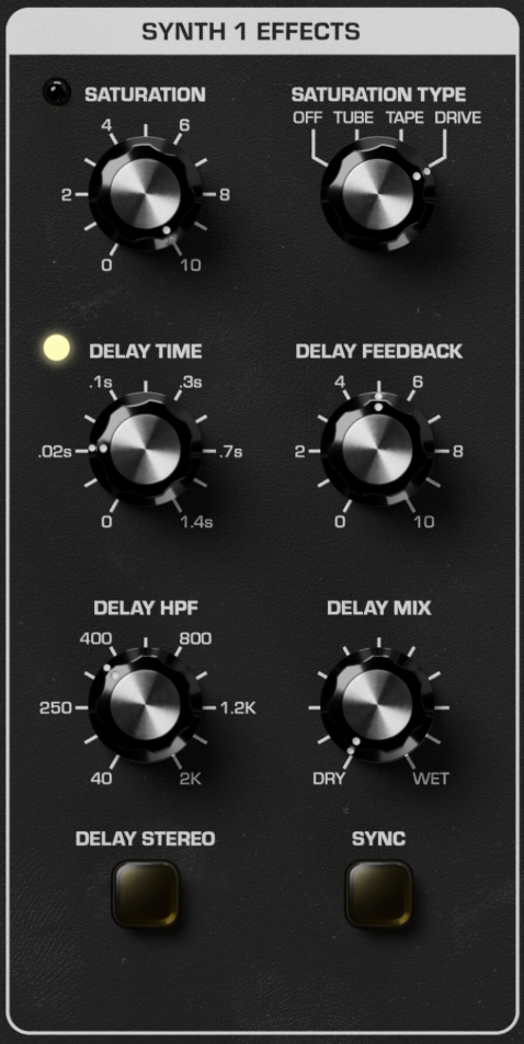 DELAY TIME – Sets the delay time for SYNTH 1’s delay effect – from 0 seconds to 1.4 seconds. When SYNC is enabled the time divisions will display around the knob.
