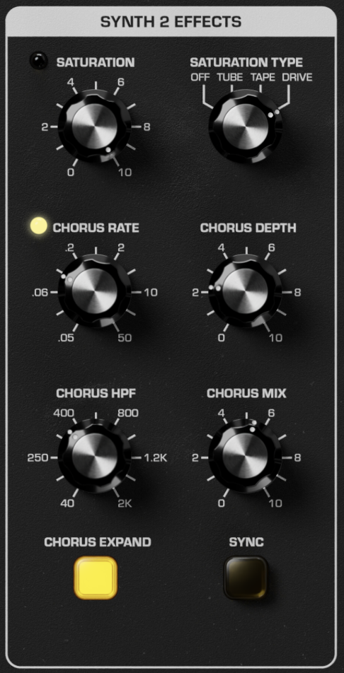 SATURATION – Adjusts the amount of SATURATION applied to SYNTH 2.
