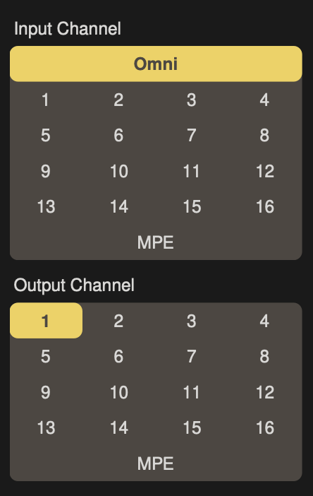 Set the MIDI channel for receiving data - either OMNI (all Channels); 1-16; or MPE (MIDI Polyphonic Expression).