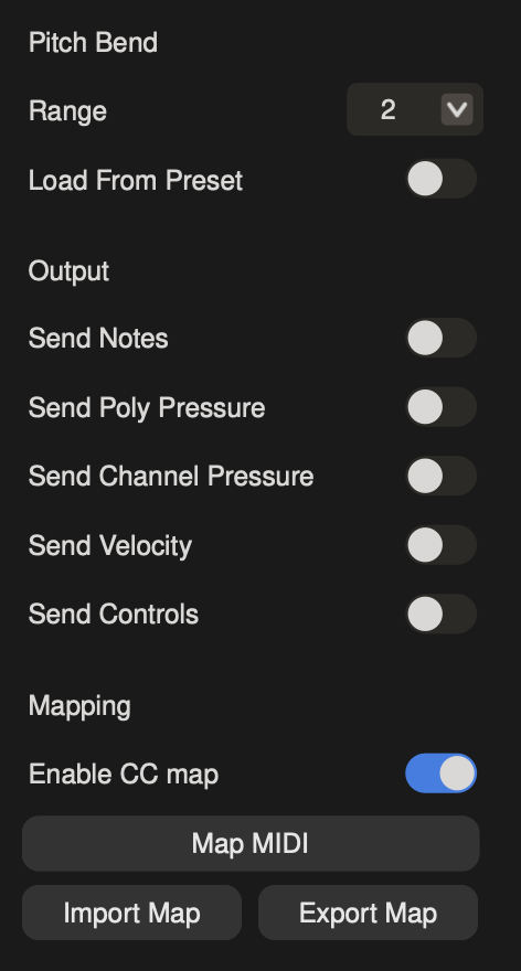 Use Import/Export Map to either export your current MIDI Map as a .ccmap file to your computer or to import any .ccmap file on your computer as a MIDI Map.