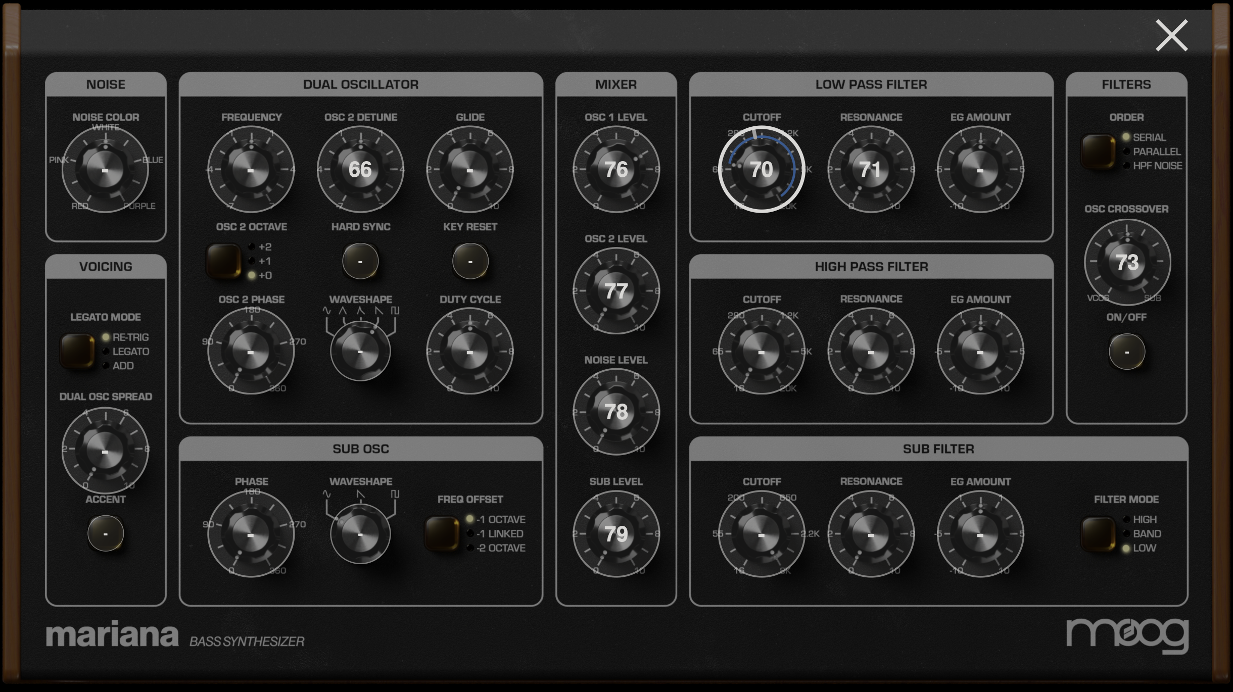If no MIDI CC is assigned to a specific parameter, the value displayed will be [ - ]. To make a MIDI CC assignment, simply click a knob or switch and then operate the corresponding knob or switch on your MIDI controller. The first MIDI CC number that Mariana detects will be assigned to that parameter. Repeat this process for other knobs and switches.