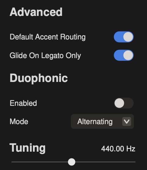 When turned ON, the ACCENT button will drive the envelope generators harder when enabled and when note velocity exceeds 96 – creating an accented note when playing harder and unaccented notes when playing softer. Turned OFF, the ACCENT button can be used as an additional modulation source which will not affect the envelopes.