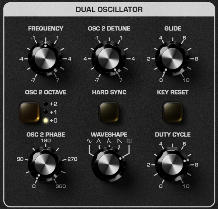 An Oscillator is the primary source of sound in any synthesizer – the basic building block of a tone which the filters and amplifiers shape later on. Mariana contains two oscillators which share timbral controls (WAVEFORM, DUTY CYCLE) but which can be detuned and phase offset from each other for precise control of your sound.