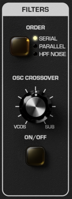 ORDER – Sets the order of the low-pass and high-pass filters. After the MIXER, the mix of OSC 1, OSC 2, and NOISE can take one of three paths:
