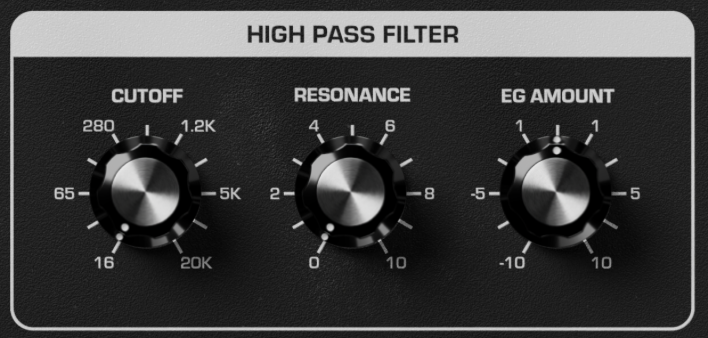 RESONANCE – Controls the amount of filter output fed back into the input – creating a resonant peak at the high-pass filter CUTOFF frequency.