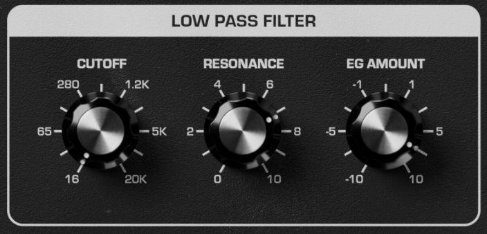 The LOW PASS FILTER is used to remove high frequencies from your sound and is a critical component for creating bass tones. Waveforms such as PULSE and SAW are full of bright high end, but by filtering them with the LOW PASS FILTER and adding some envelope modulation via EG AMOUNT you can build classic electronic bass tones.