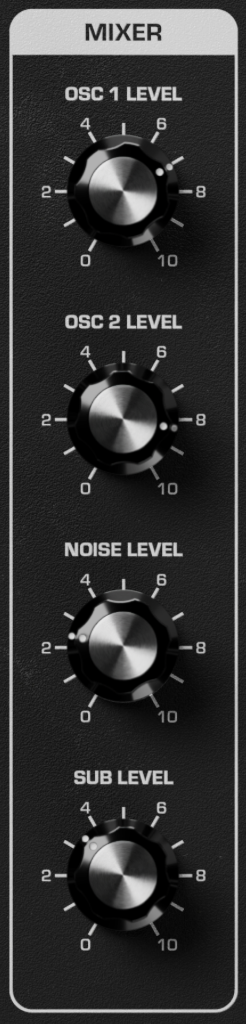 OSC 1 LEVEL – Sets the volume level of OSC 1 – begins to overdrive slightly above 7.