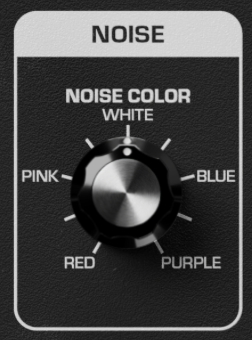 NOISE COLOR - Tilts the NOISE generator from WHITE (flat frequency response) to more low-frequency weighted noise colors counter-clockwise (RED through PINK) or more high-frequency weighted colors clockwise (BLUE through PURPLE).