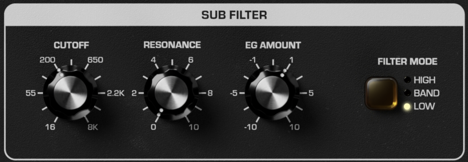 FILTER MODE – Sets the filter type for the SUB FILTER – either a LOW pass filter, HIGH pass filter, or BAND pass filter.