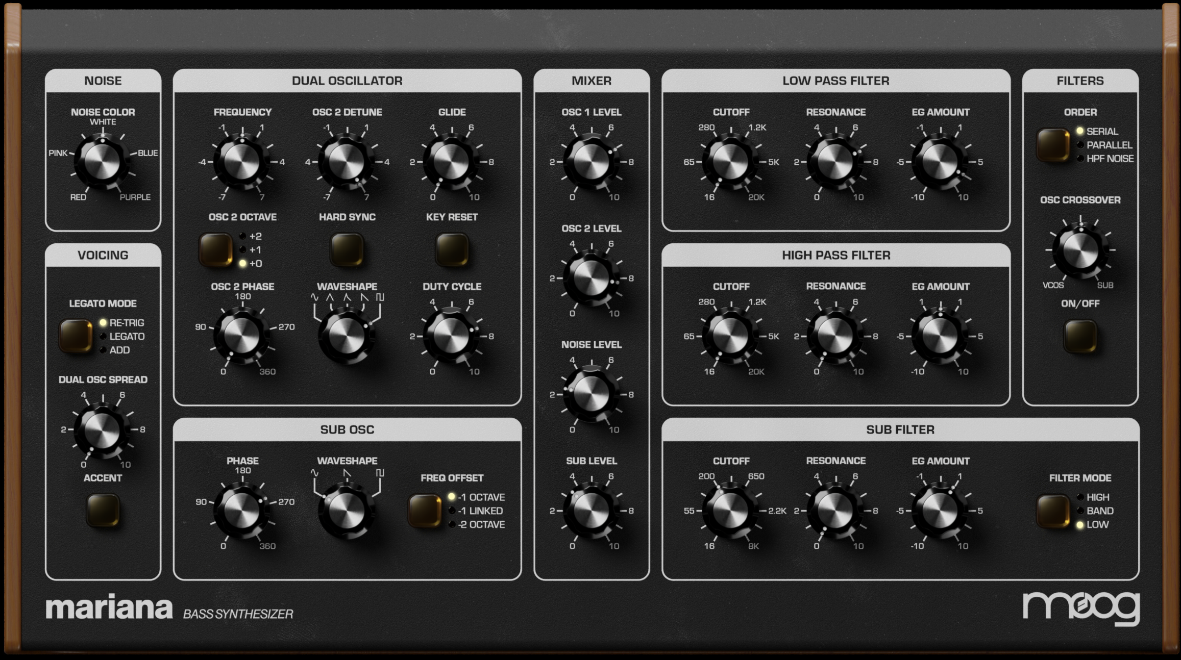 Mariana’s synthesis engine consists of a dual oscillator with controls for waveform, detuning, phase, and more. Mariana also contains a dedicated sub-oscillator for deeper bass tones and a noise generator for adding texture. The mix of OSC 1, OSC 2, and the NOISE generator is sent to two filters: a high-pass and a low-pass filter with a switch to determine their routing. The SUB OSC is sent to its own dedicated multi-mode filter. Finally, a crossover filter provides a spectral crossfade between the dual oscillators and the sub-oscillator.