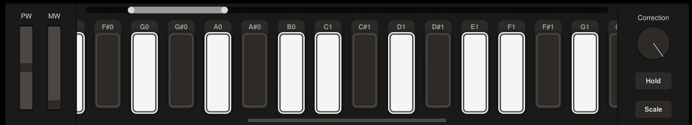 Correction sets pitch correction between keys. At maximum, full correction occurs. Set halfway, rocking your finger side to side will allow for vibrato and pitch bend effects. At minimum, there is no pitch correction between keys and therefore Mariana's keys function as a continuous ribbon controller.