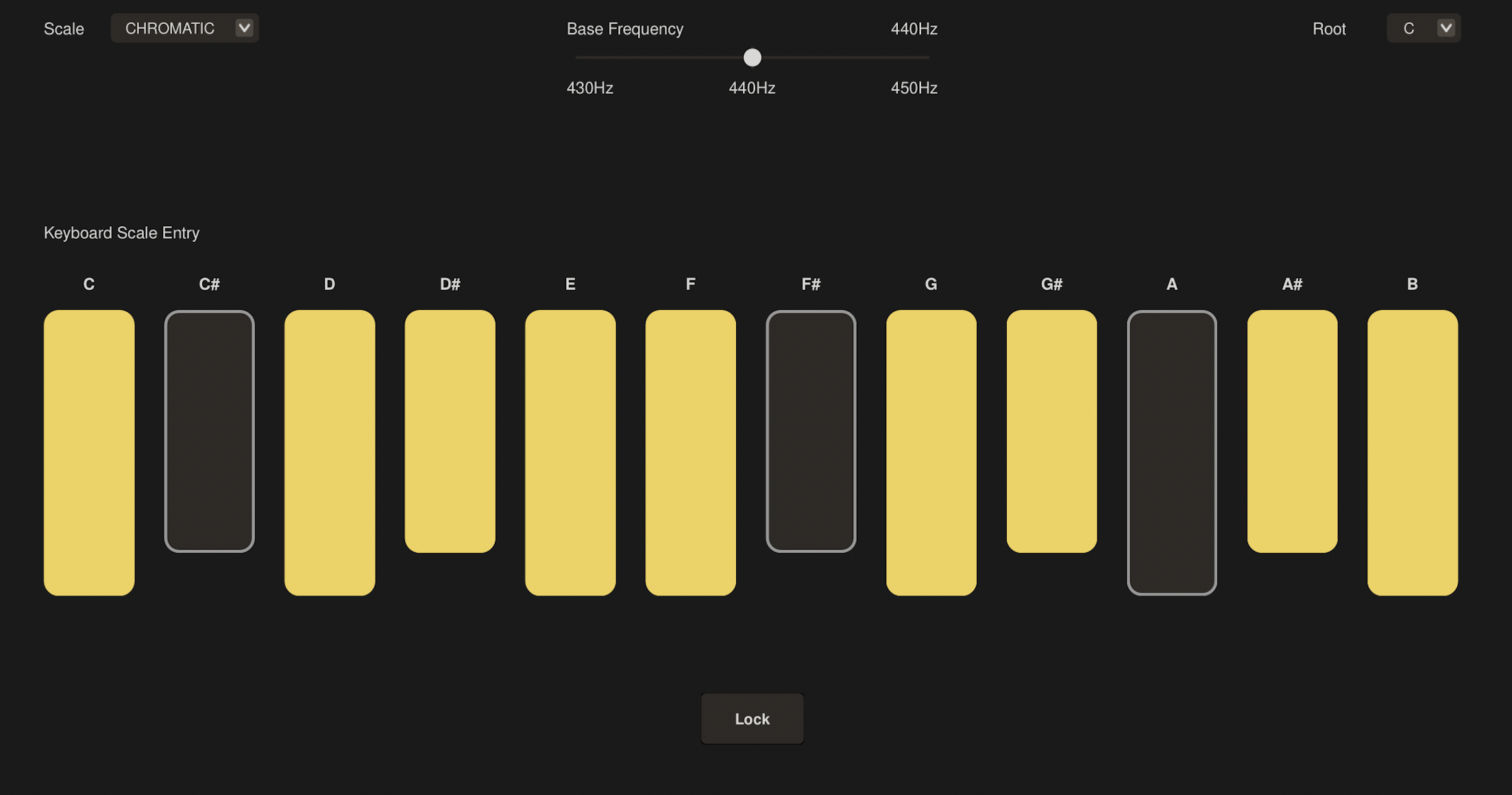 Notes can be added and removed from any scale by touching the keys in the keyboard display.